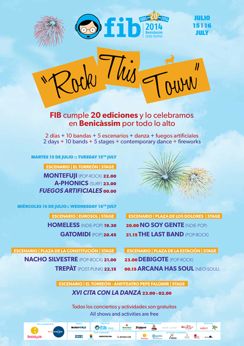 Por su 20 aniversario el FIB nos trae Rock This Town, su propia celebración por todo lo alto que tomará la ciudad durante el martes 15 y el miércoles 16 de julio. Estos dos días actuarán 10 bandas distribuidas en 5 escenarios que se repartirán por Benicassim. Además, la XVI Cita con la Danza y Fuegos artificiales.