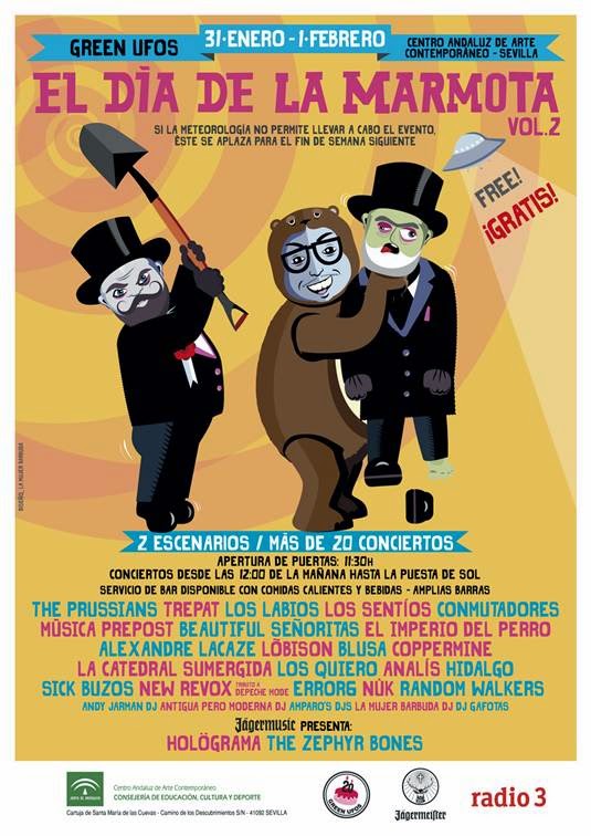 Supongo que, gracias a Bill Murray, todos conocemos la tradición americana de pronosticar si el invierno se prolongará o no en función de si la marmota de asusta de su sombra al salir de su madriguera. En esta tradición se basaron el año pasado en Sevilla para sacarse de la manga un nuevo festival, El Día de la Marmota, que en su primera edición pudo presumir de la asistencia de más de 3000 personas, y que contó con bandas como Pájaro, Tentudía, o Sick Buzos (que repiten este año). En esta ocasión podremos ver, entre otros muchos, a The Prussians, Trepàt, Los Sentíos o Los Labios.