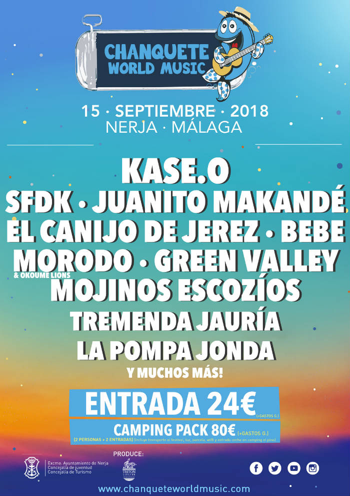 Siete artistas se añaden a la programación del próximo Chanquete World Music, a celebrar el sábado 15 de septiembre en Nerja (Málaga): la arrolladora personalidad de El Canijo de Jerez, el fresco hip hop de unos maduros y veteranos SFDK, la contagiosa luz de una renovada Bebe, los ritmos cálidos de Green Valley, la desbordante simpatía de Mojinos Escozíos, los aullidos tropicales de Tremenda Jauría y la fusión sin fronteras de La Pompa Jonda.