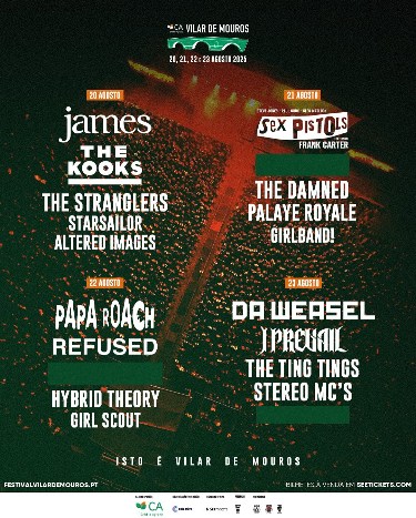 El Festival CA Vilar de Mouros anunció su cartel para su edición del 20 al 23 de agosto consolidando su legado como el decano de los festivales ibéricos con un lineup que reúne a Papa Roach, Sex Pistols feat. Frank Carter, James, The Kooks, Refused, I Prevail, The Stranglers, The Damned, The Ting Tings, Palaye Royale, Hybrid Theory, Stereo MC’s, Starsailor, Altered Images, Girl Scout, y los portugueses Da Weasel. En un 2025 donde los festivales buscan equilibrar nostalgia y vanguardia, Vilar de Mouros no solo celebra 60 años de historia; construye un puente sonoro entre generaciones, resonando desde el Minho hasta el mundo.